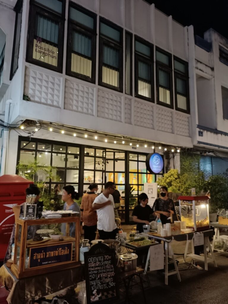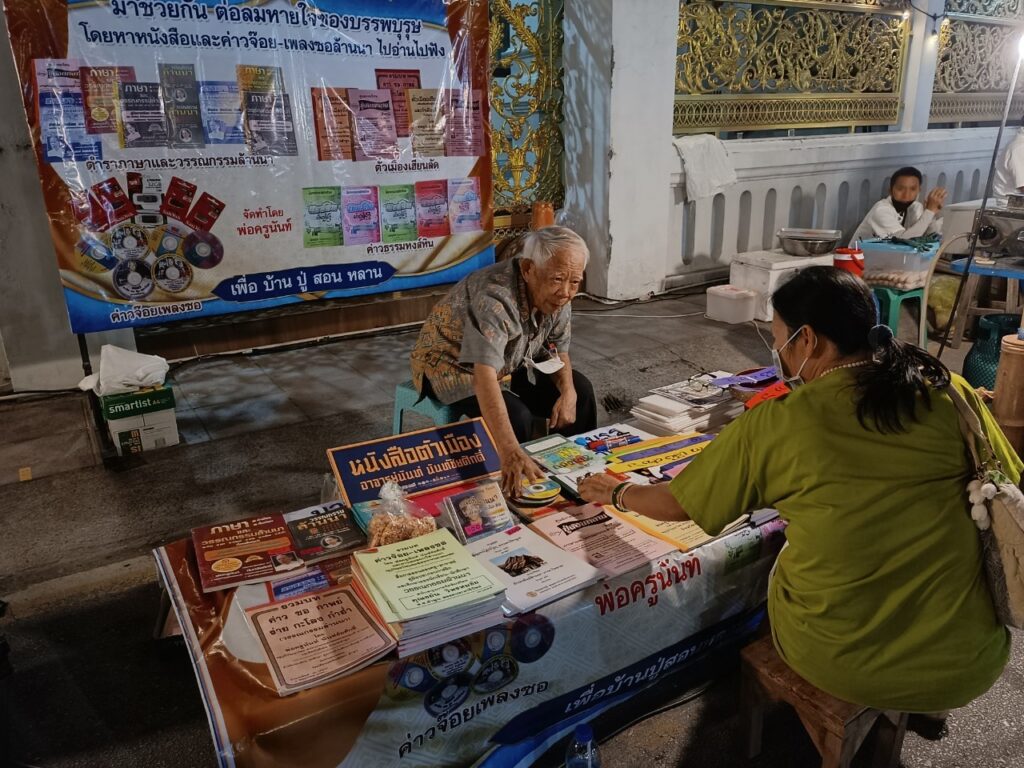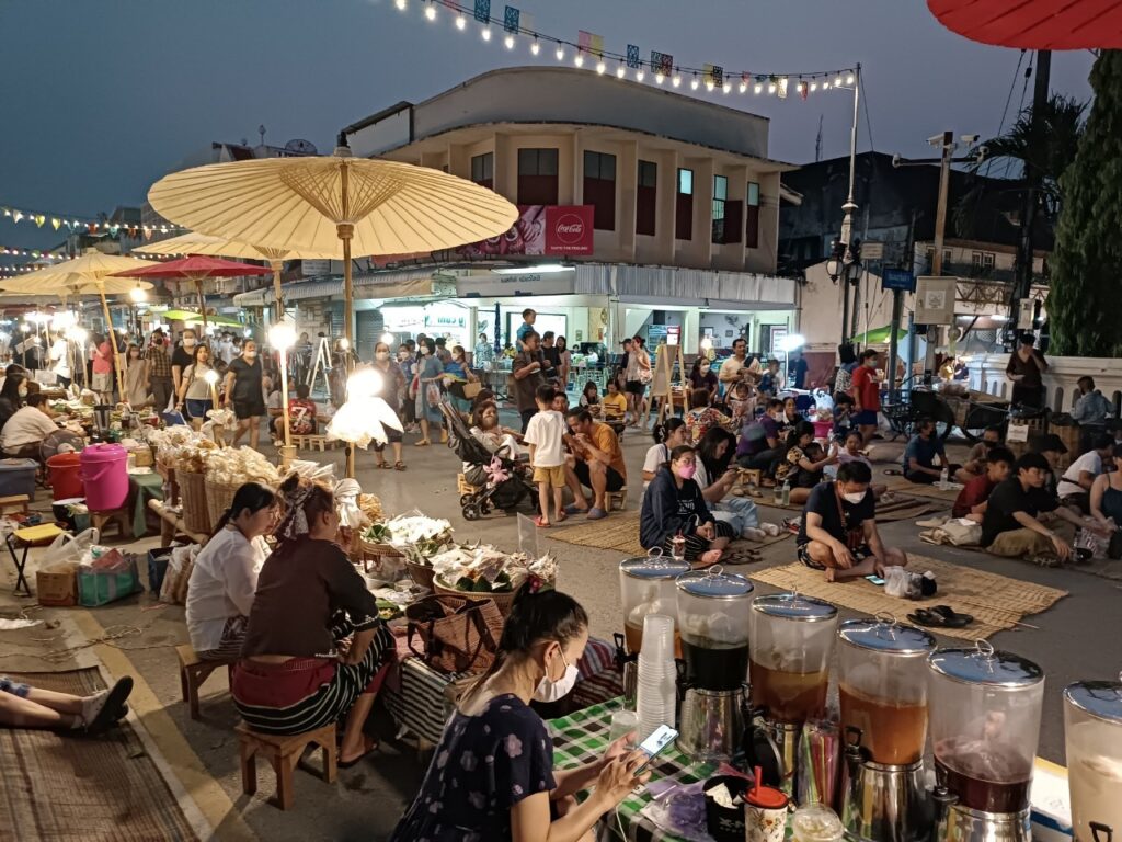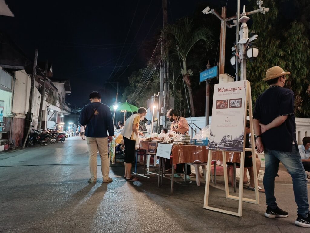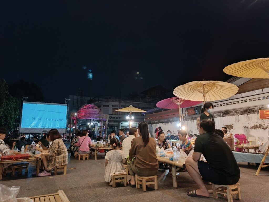คำบรรยาย เสียงผู้คนที่มาเที่ยวงานอินทยงยศพูดคุยกันระหว่างที่นั่งรับประทานอาหารบนแคร่ที่ตั้งอยู่บริเวณหน้าพื้นที่จัดฉายหนังกลางแปลง