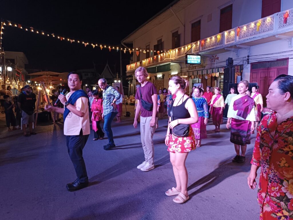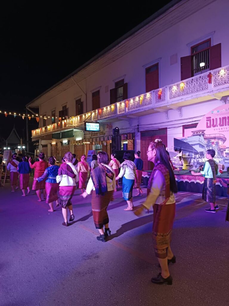 คำบรรยาย เสียงกิจกรรมการสอนเต้นบาสโลปในงานอินทยงยศครั้งที่ 1 ให้แก่ผู้ที่มาเที่ยวในงานอินทยงยศ